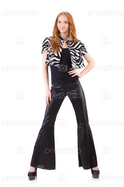 Рыжая женщина в черных расклешенных брюках