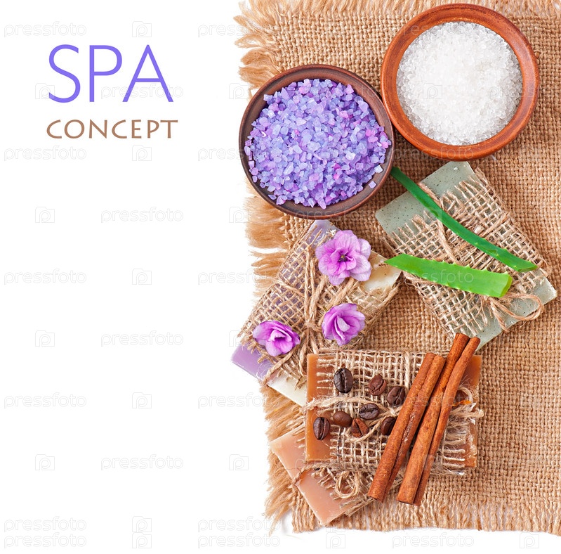 Натуральное мыло и соль, изолированные на белом фоне