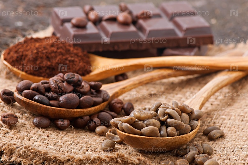 Зеленый, обжаренный и молотый кофе в деревянных ложках