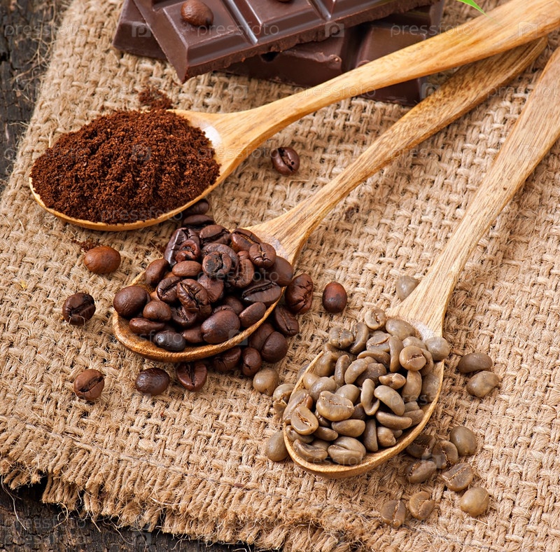 Зеленый, обжаренный и молотый кофе в деревянных ложках