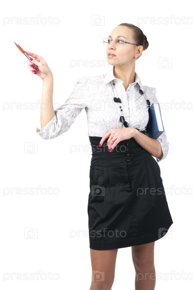 Молодая бизнес-леди с блокнотом и ручкой на белом фоне