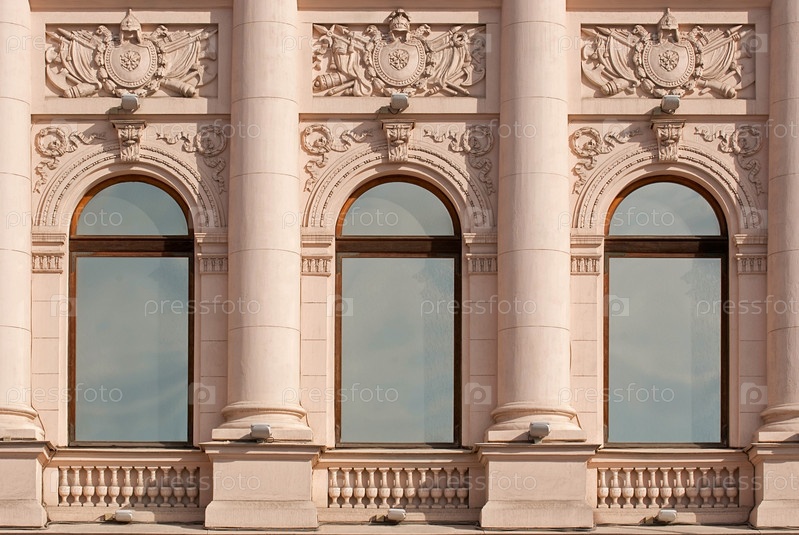 Окна с колоннами на стене с барельефом