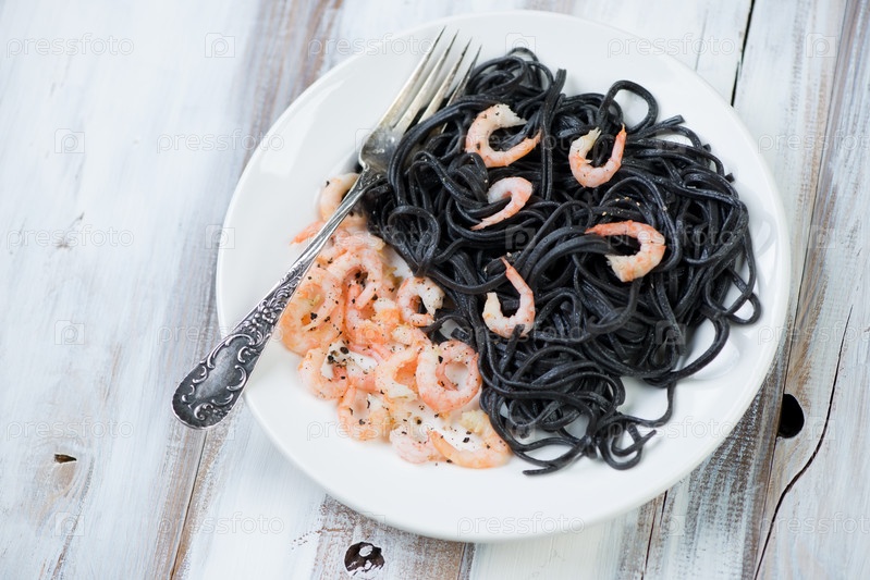 Черные тальятелле с креветками