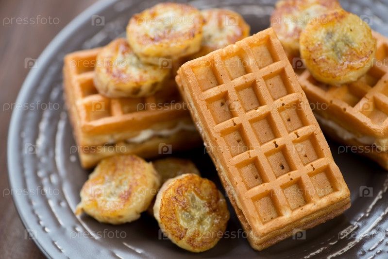 Вафли с ломтиками жареных бананов