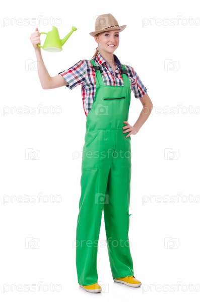Женщина с лейкой на белом фоне