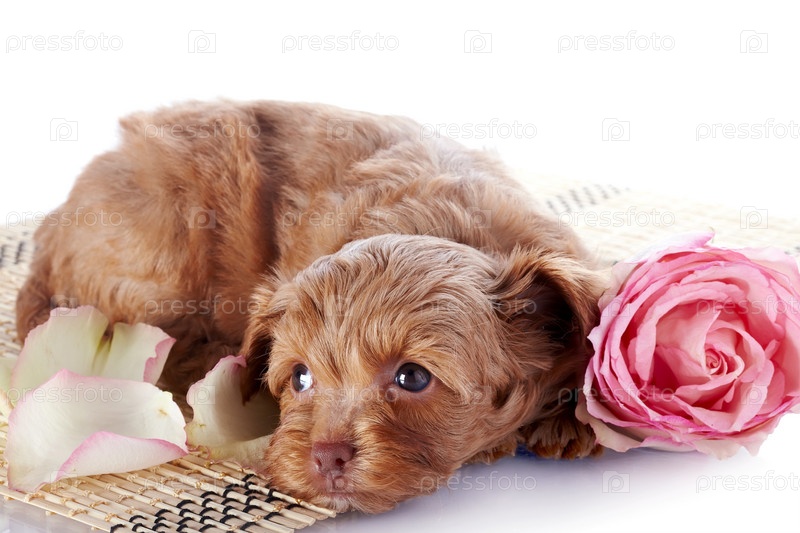 Щенок с розовой розой на коврике