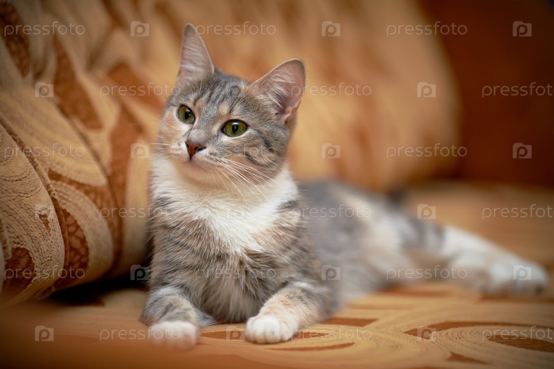 Серая кошка с зелеными глазами лежит на диване