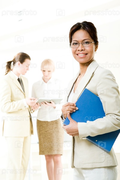 Портрет успешной дамы, смотрящей на камеру с общающимися коллегами по работе в фоновом режиме