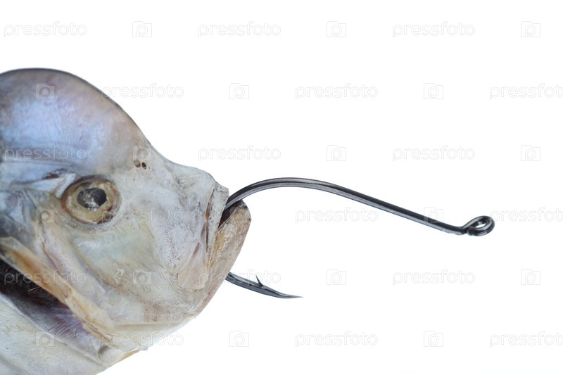 Вяленая рыба на крючке на белом фоне