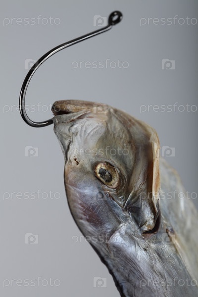 Вяленая рыба на крючке на сером фоне