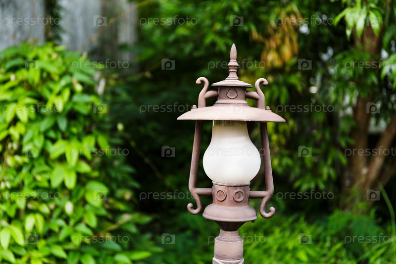 Уличный фонарь в зеленом саду