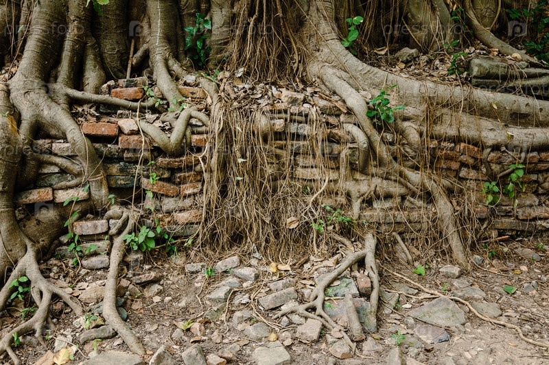 Корни дерева на кирпичной стене