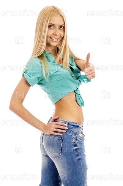 Молодая блондинка показывает большой палец