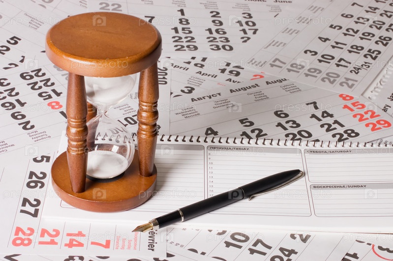 Песочные часы, ежедневник и шариковая ручка на листах календаря