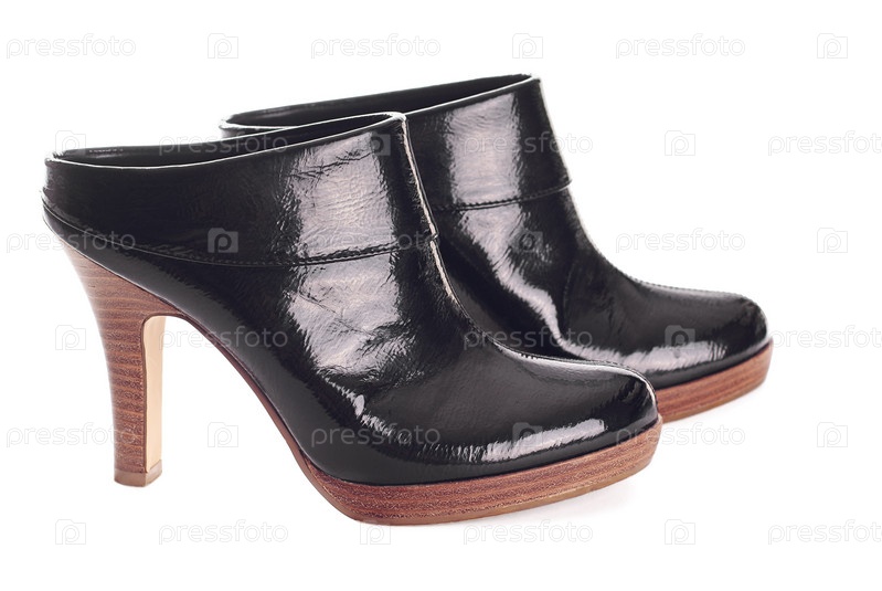 Пара черных женских туфель на каблуках на белом фоне
