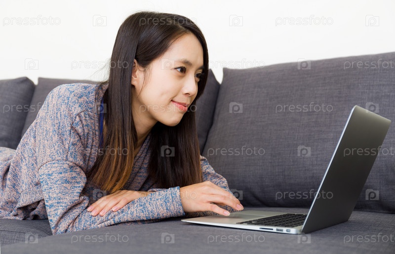 Азиатская женщина с ноутбуком на диване