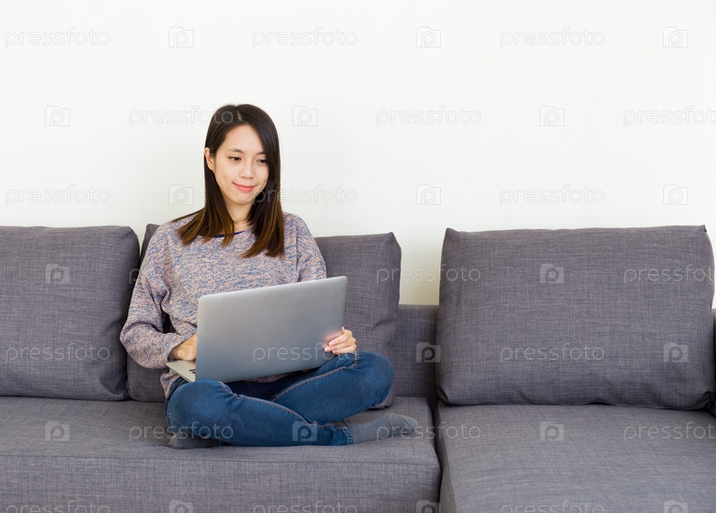 Азиатская женщина с ноутбуком на диване