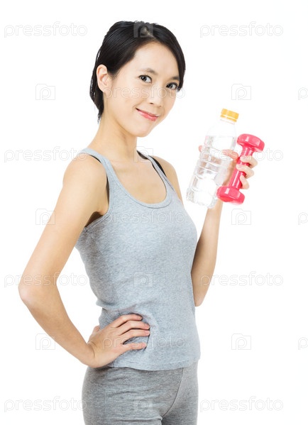 Женщина с гантелей и бутылкой воды