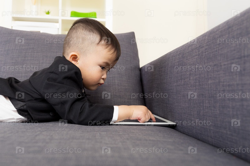 Маленький мальчик с планшетом на диване