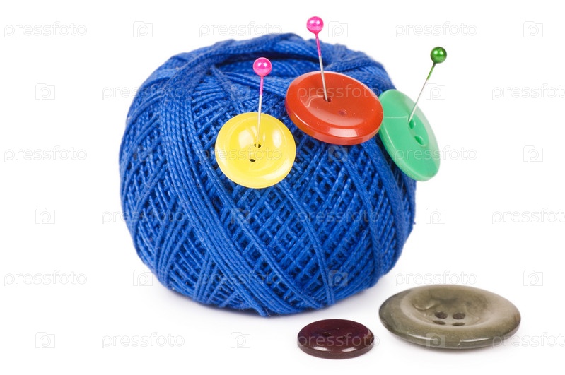 Моток пряжи, иголки и пуговицы на белом фоне