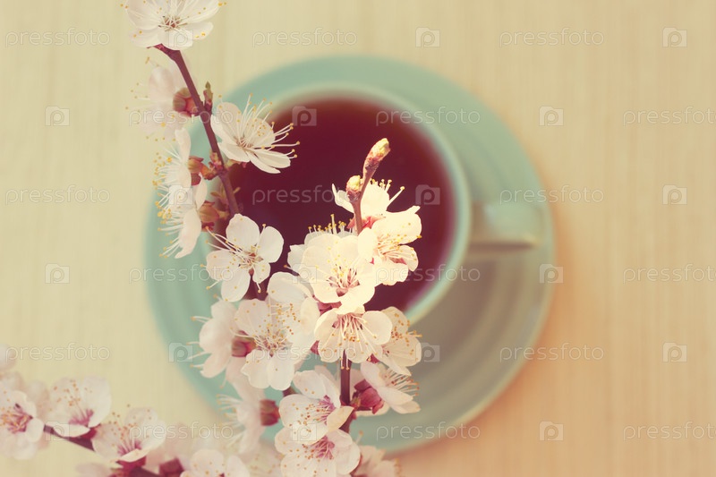 Чашка чая и ветка цветущей вишни