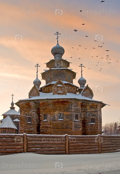 Деревянная церковь на фоне зимнего заката, Суздаль, Россия