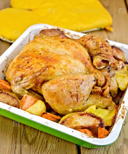 Курица запеченная с овощами на доске с прихваткой