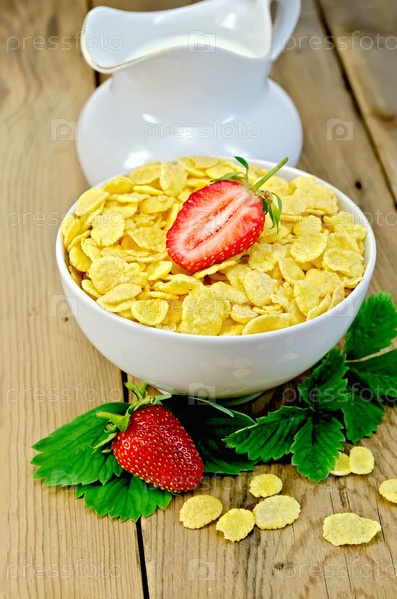 Кукурузные хлопья с клубникой и молоком на доске