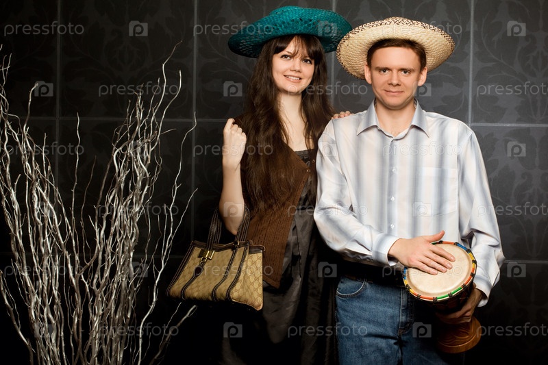 Молодая пара в сомбреро и с барабаном