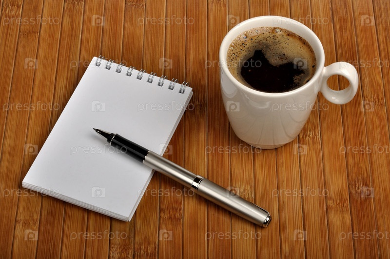 Блокнот с ручкой и чашка кофе