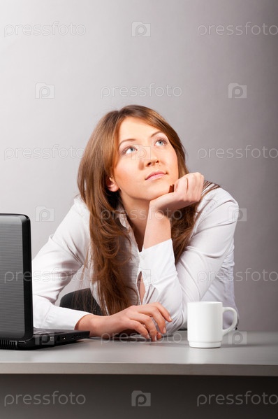 Деловая женщина сидит в офисе и задумчиво смотрит в сторону