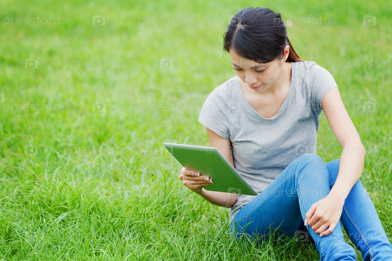 Женщина с планшетом сидит на траве