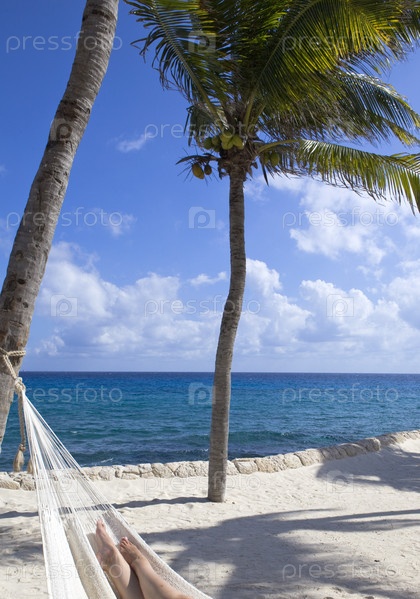 Женские ноги в гамаке, на фоне океана