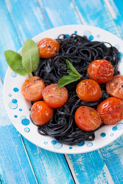 Жареные помидоры черри и черные тальятелле