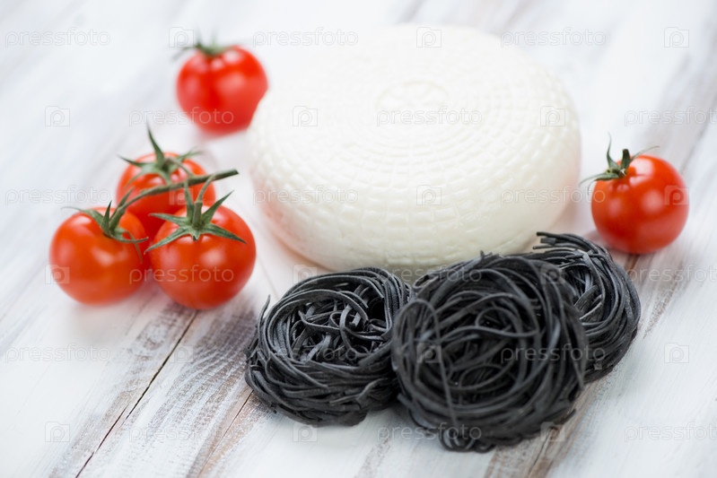 Черные тальятелле, сыр и помидоры черри