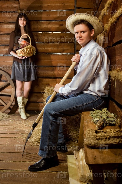 Молодой человек с вилами и девушка в деревянной избе