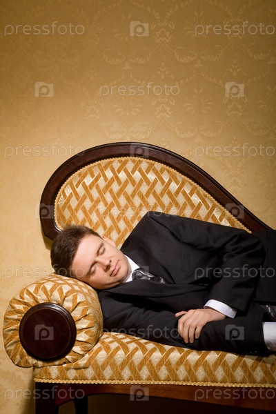Бизнесмен в костюме спит на диване в комнате