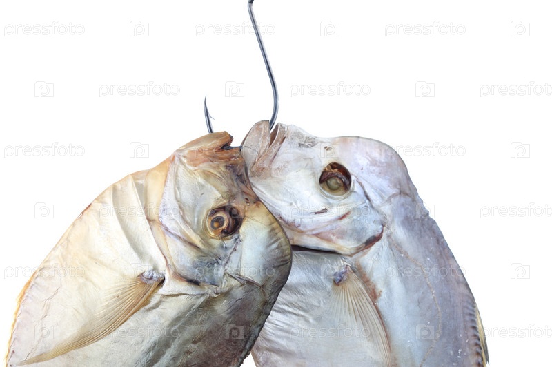 Сушеная рыба на крючке на белом фоне, крупный план