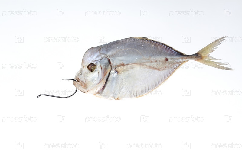 Сушеная рыба на крючке на белом фоне