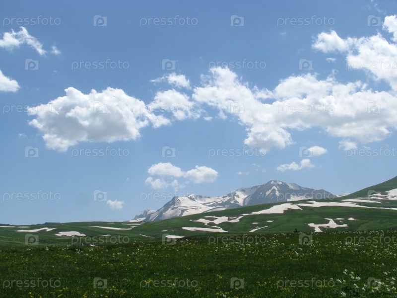 Зеленый луг и Кавказские горы вдали