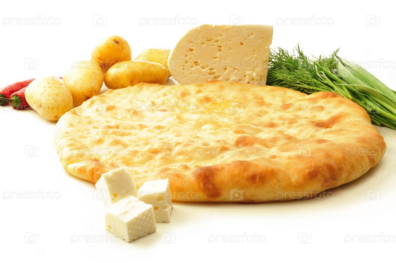 Аппетитная лепешка, овощи и сыр на белом фоне