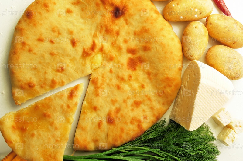 Аппетитная лепешка, овощи и сыр на белом фоне