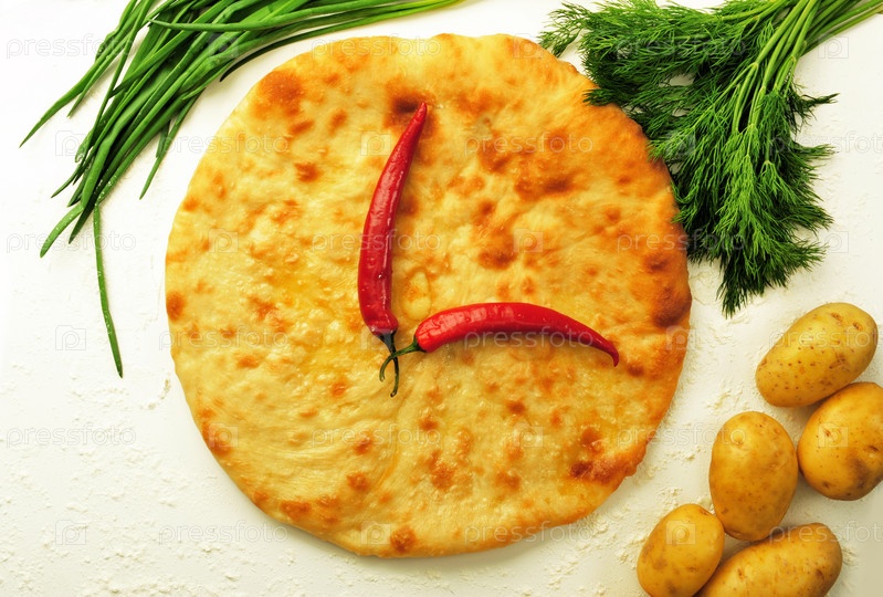 Аппетитная лепешка и овощи на белом фоне