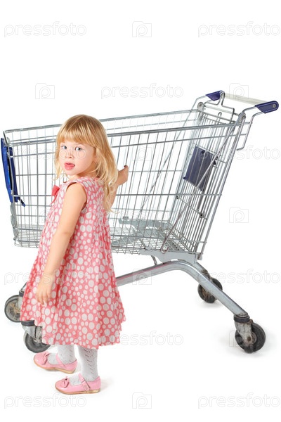 Девочка в платье стоит возле тележки для покупок. Изолирована на белом фоне