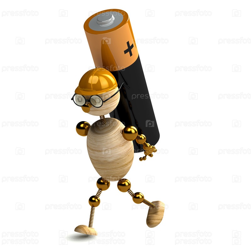 Трехмерный деревянный человечек с батарейкой на белом фоне