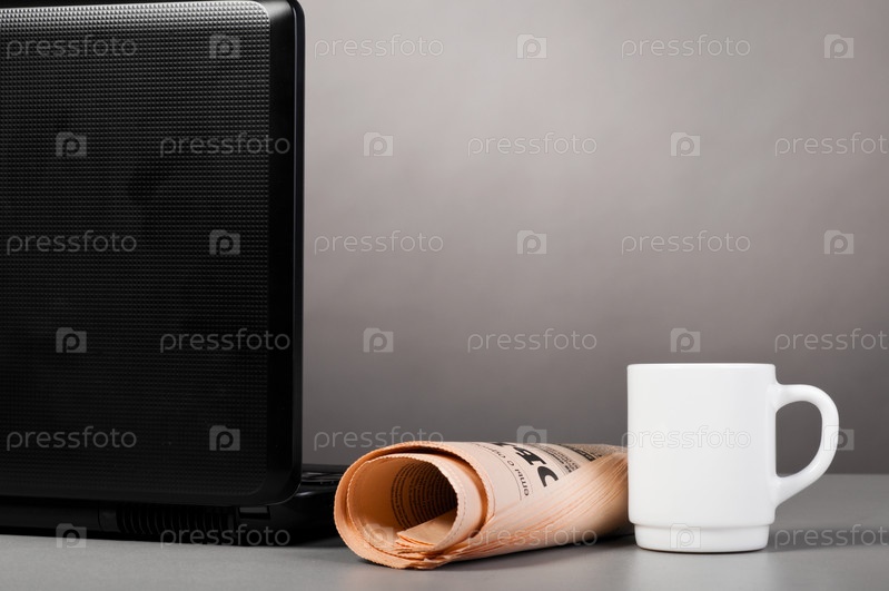 Ноутбук, чашка и газета на столе