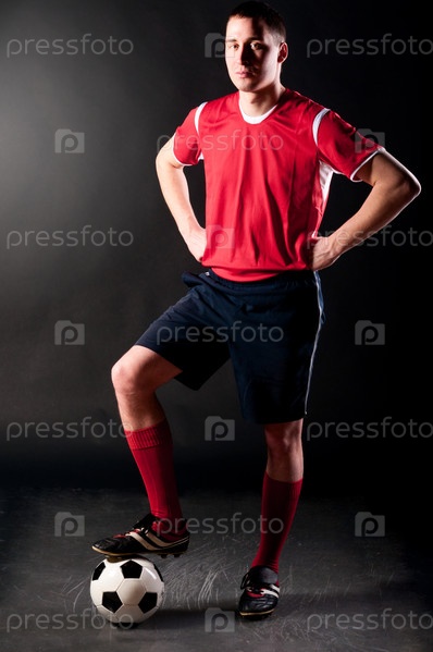 Футболист стоит с мячом на темном фоне