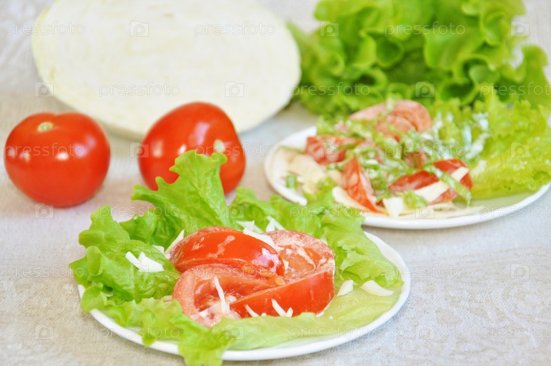 Ломтики помидора с майонезом на листе зеленого салата