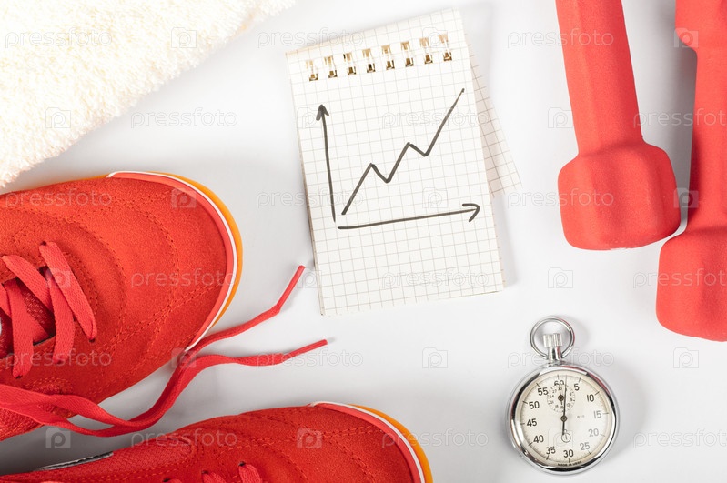 Прогресс в фитнесе: красная спортивная обувь, гантели и секундомер. Вид сверху