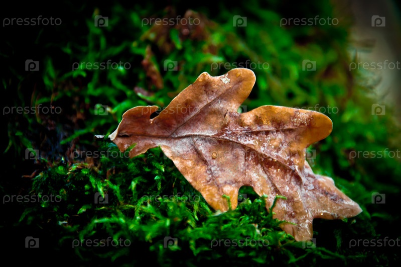 Дубовый лист на зеленой траве